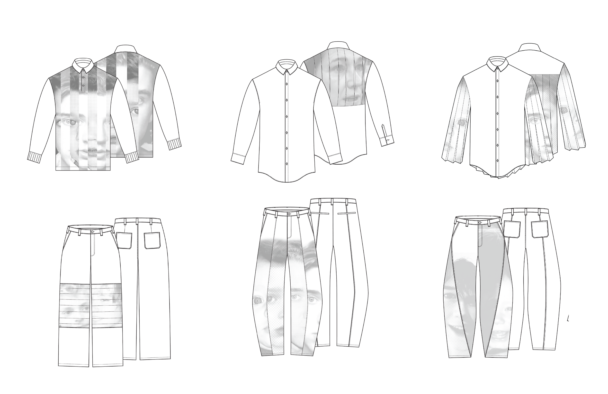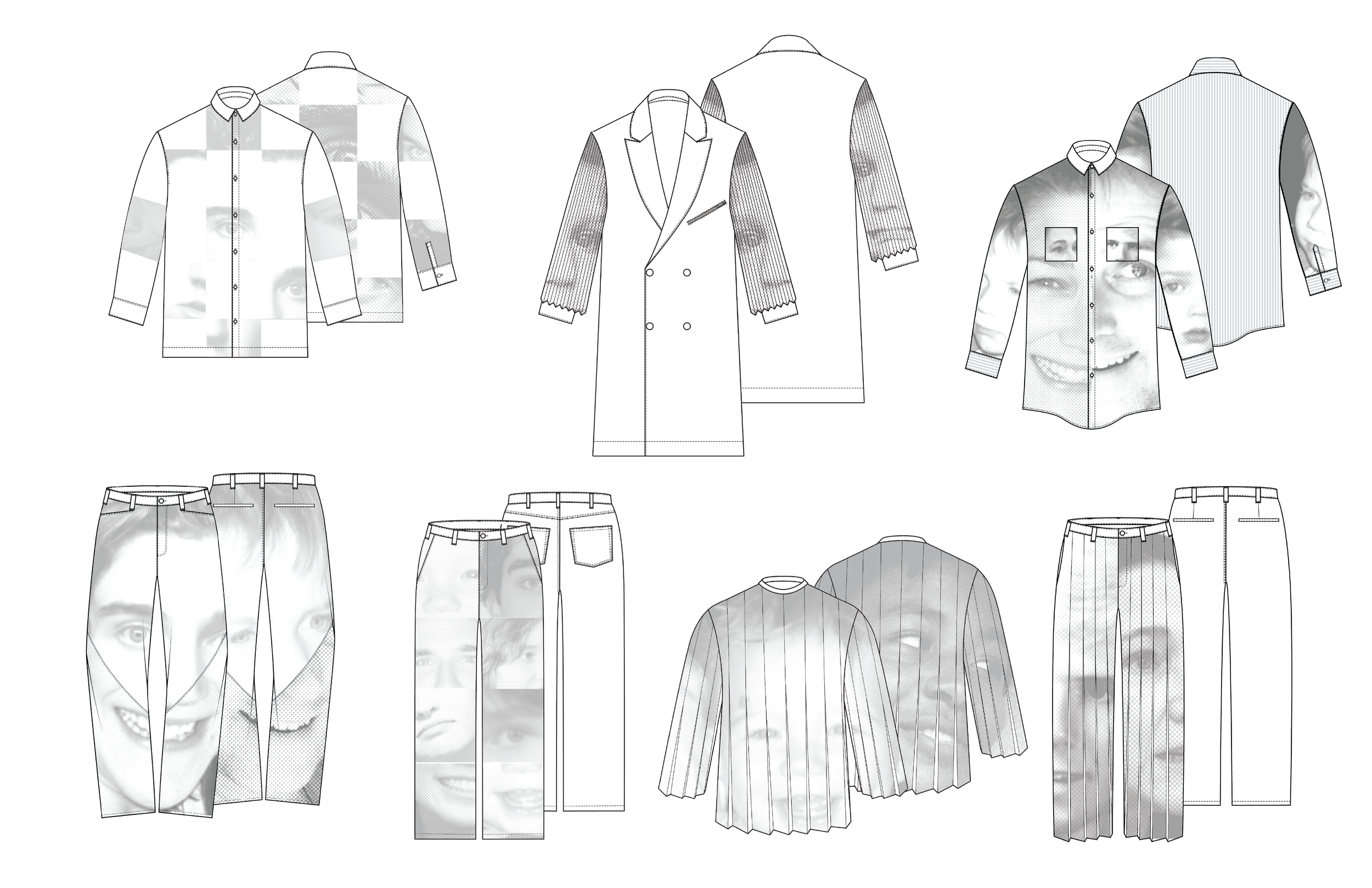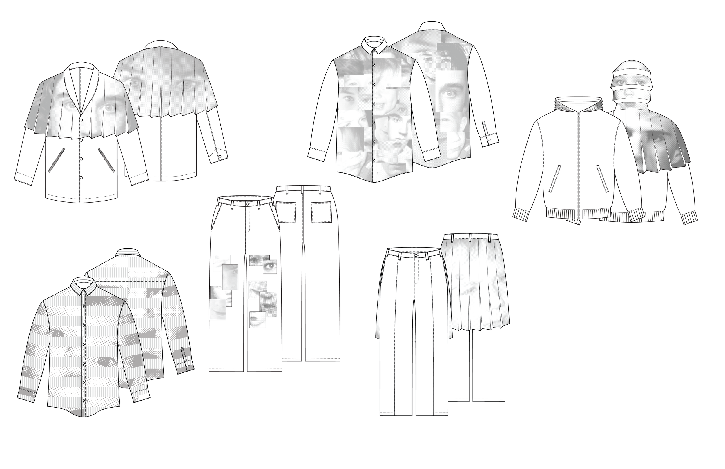 Psychosymphony turns inner chaos outward, using faces of loved ones from my own life to show the fractured ways in which we store our memories. Pleats, stripes, and checks are interlaced with facial features. Cotton canvas, nylon taslan, and cotton oxford combine for a collection that can easily be dressed up or down.